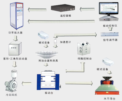 振動(dòng)臺(tái)系統(tǒng)有幾大部分組成功率放大器(簡稱功放)控制儀、振動(dòng)臺(tái)、附加臺(tái)面及夾具、制冷單元(有冷卻風(fēng)機(jī)、水冷裝置)、傳感器、水平滑臺(tái)。