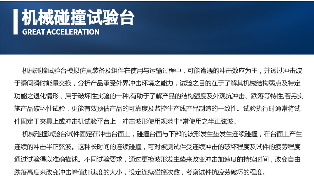 用途:機械碰撞試驗臺模擬仿真裝備及組件在使用與運輸過程中,可能遭遇的沖擊效應為主,并透過沖擊波于瞬間瞬時能量交換,分析產品承受外界沖擊環境之能力,試驗之目的在于了解其機